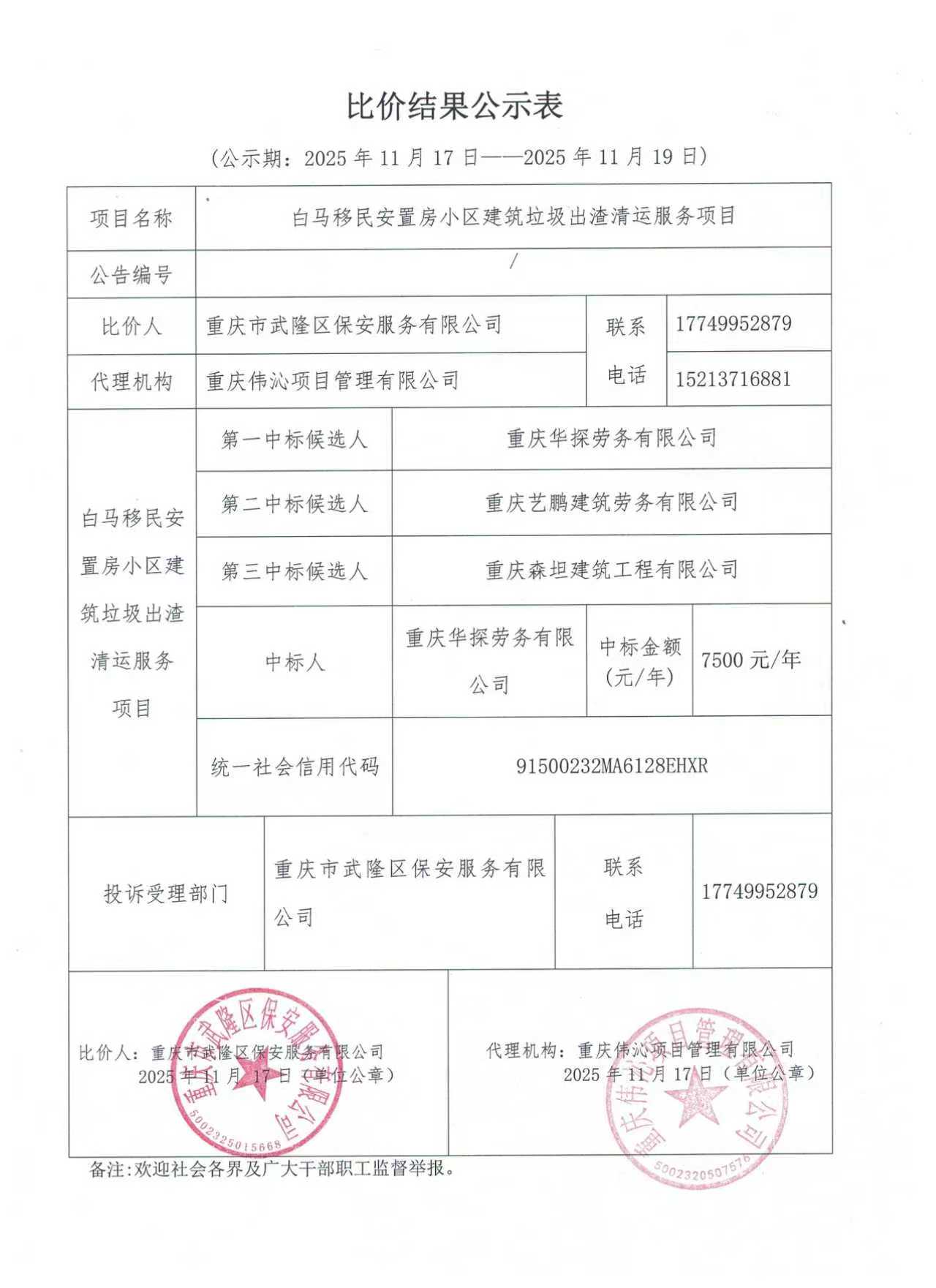 白马移民安置房小区建筑垃圾出渣清运服务项目比价结果公示